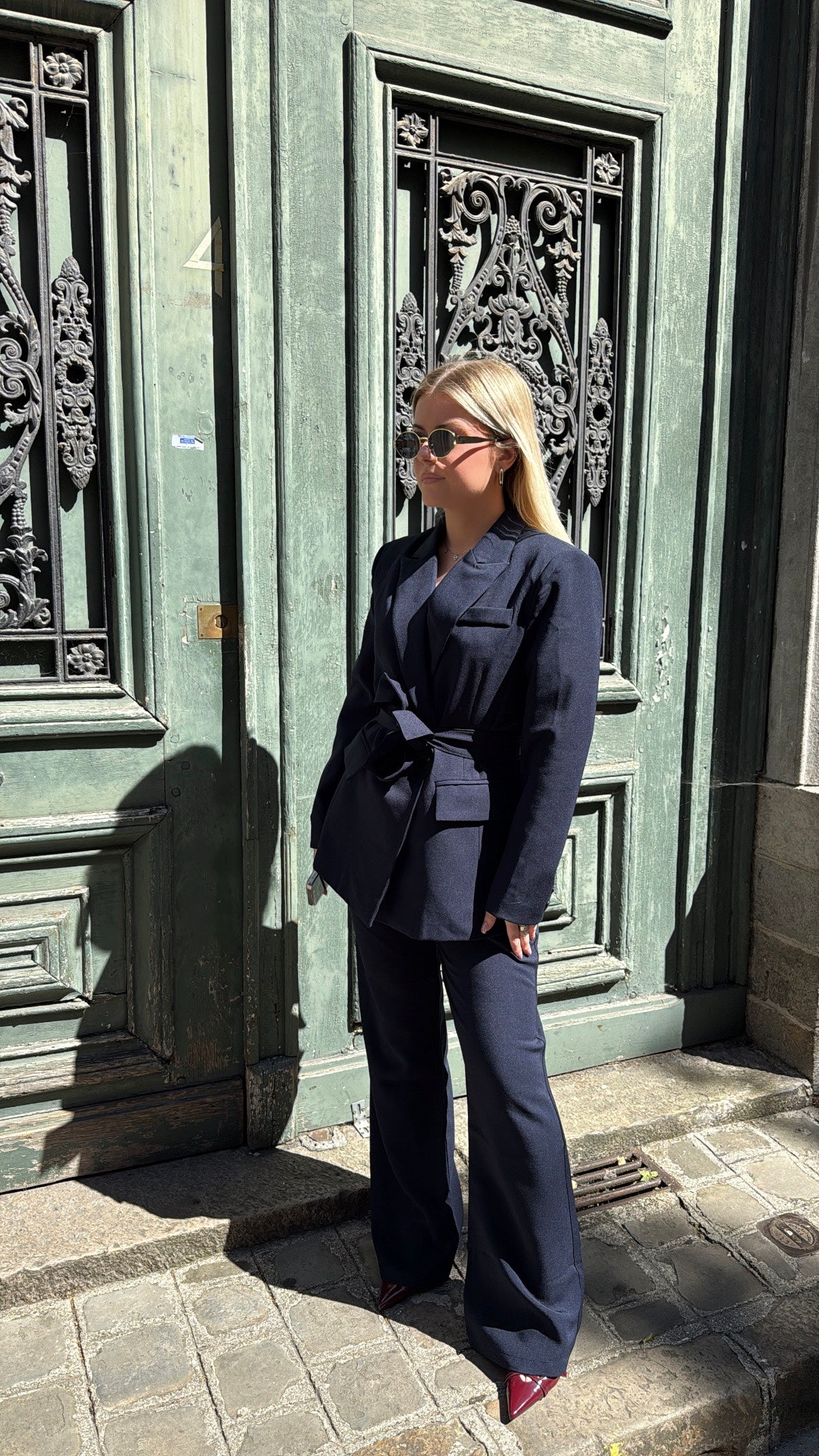 Polyvalent et élégant, le pantalon GABIE bleu marine évasé se porte aussi bien avec des escarpins pour un look chic qu’avec des baskets pour un style décontracté. Il est doté d’un bouton à la taille, de poches classiques à l’avant et de fausses poches à l’arrière, et peut être ceinturé pour marquer la silhouette, alliant confort et style en toute occasion